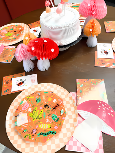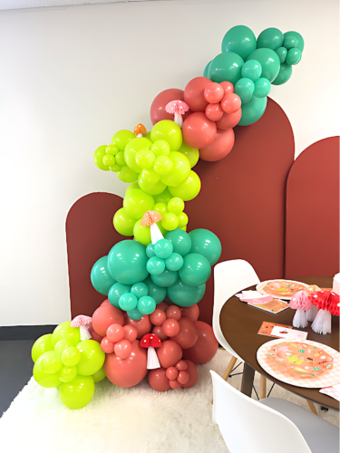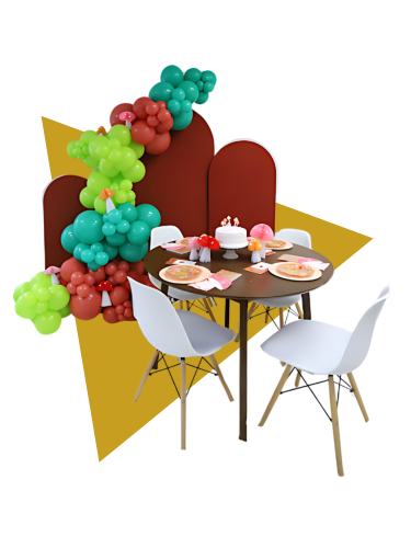 This delightful set includes dinnerware for 8 people, a cute mushroom paper decor, a vibrant balloon garland, and a stylish triple-panel backdrop to set the perfect scene.