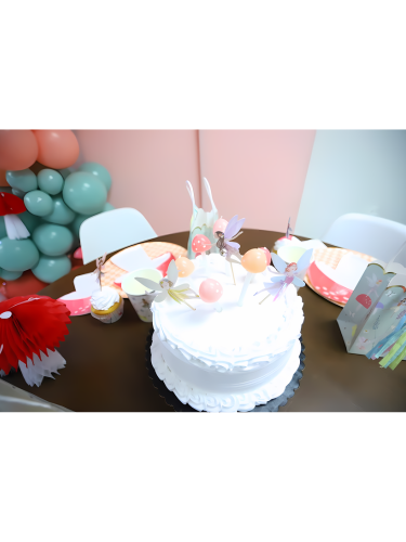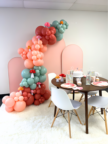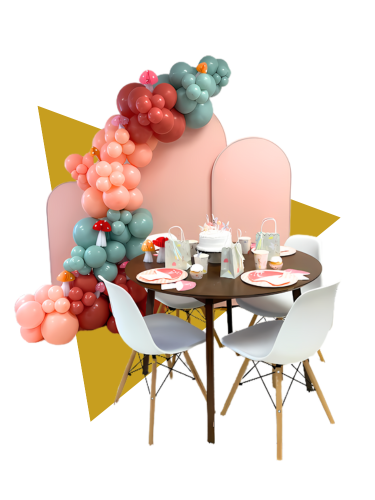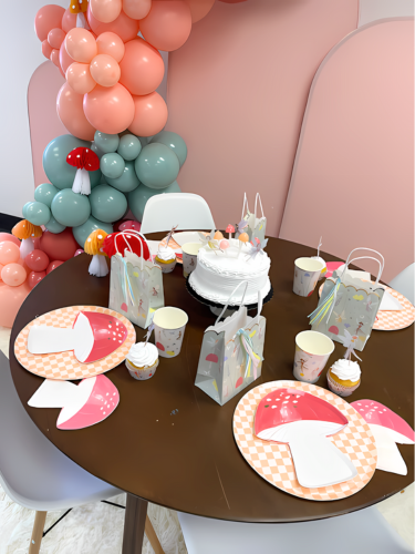 This delightful set includes dinnerware for 8 people, a cute mushroom paper decor, a vibrant balloon garland, and a stylish triple-panel backdrop to set the perfect scene.