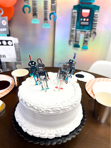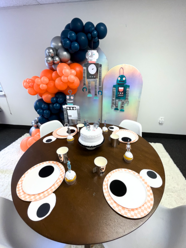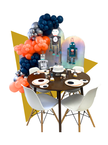 This delightful set includes dinnerware for 8 people, cute robot decor, a vibrant balloon garland, and a stylish triple-panel backdrop to set the perfect scene.