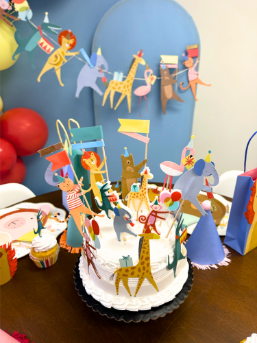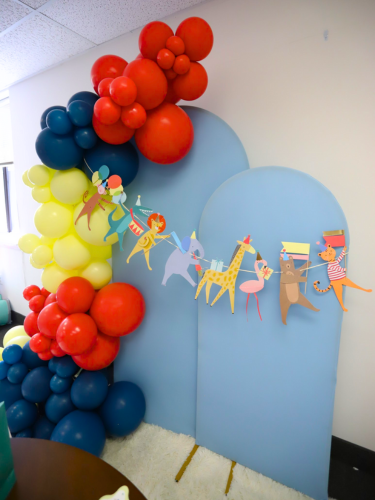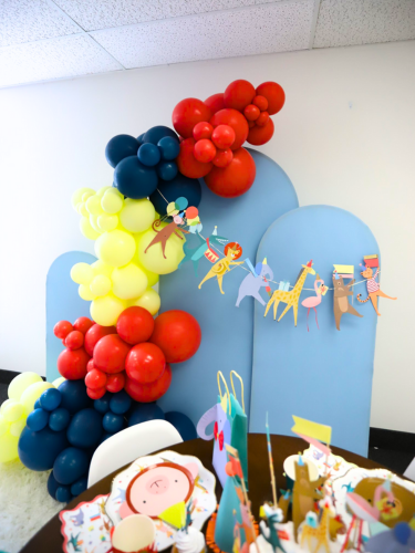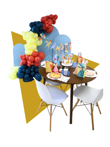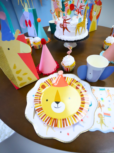 This delightful set includes dinnerware for 8 people, cute animal-themed decor, a vibrant balloon garland, and a stylish triple-panel backdrop to set the perfect scene.